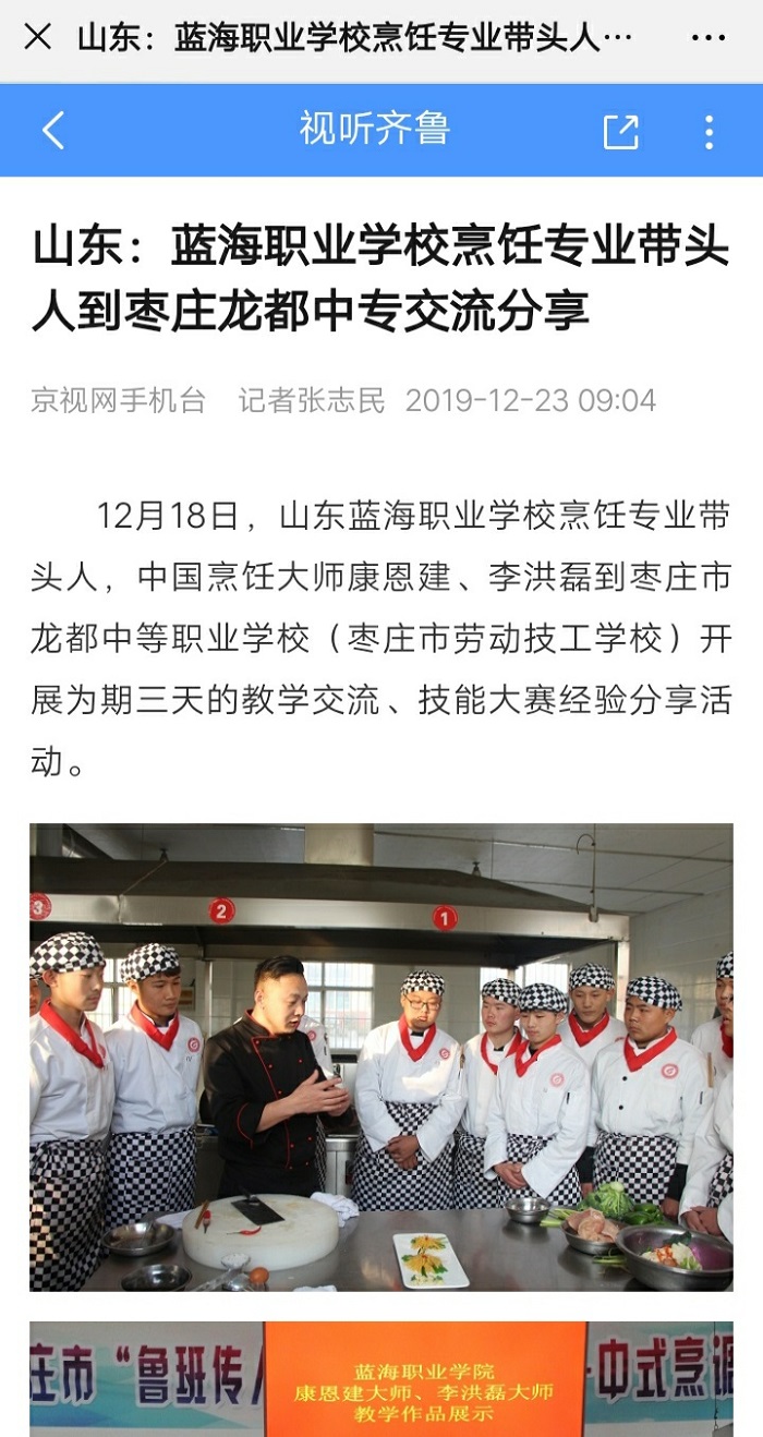 12月18日,山东蓝海职业学校烹饪专业带头人,中国烹饪大师康恩建、李洪磊到枣庄市龙都中等职业学校(枣庄市劳动技工学校)开展为期三天的教学交流、技能大赛经验分享活动。