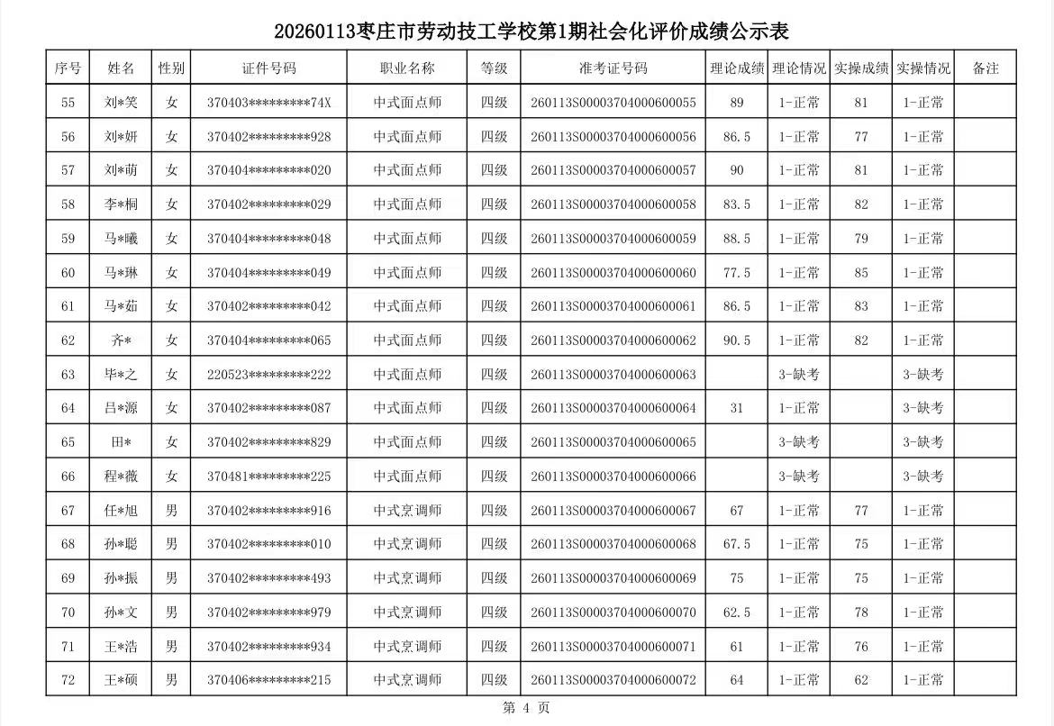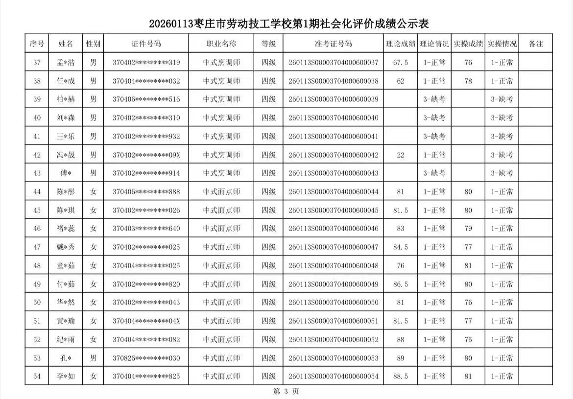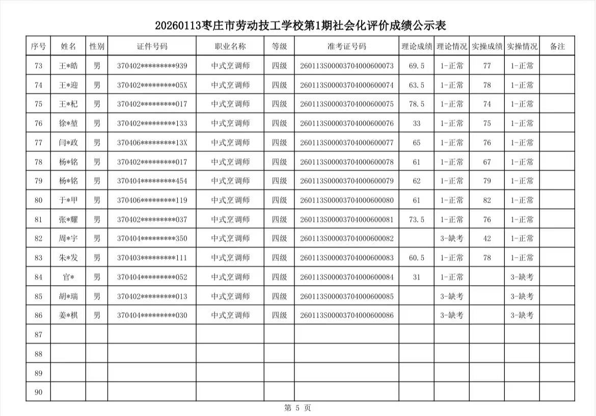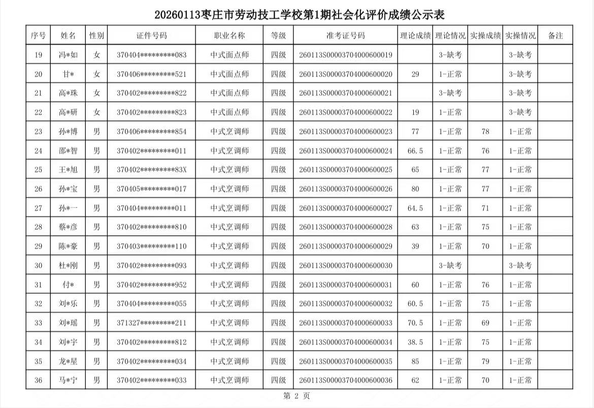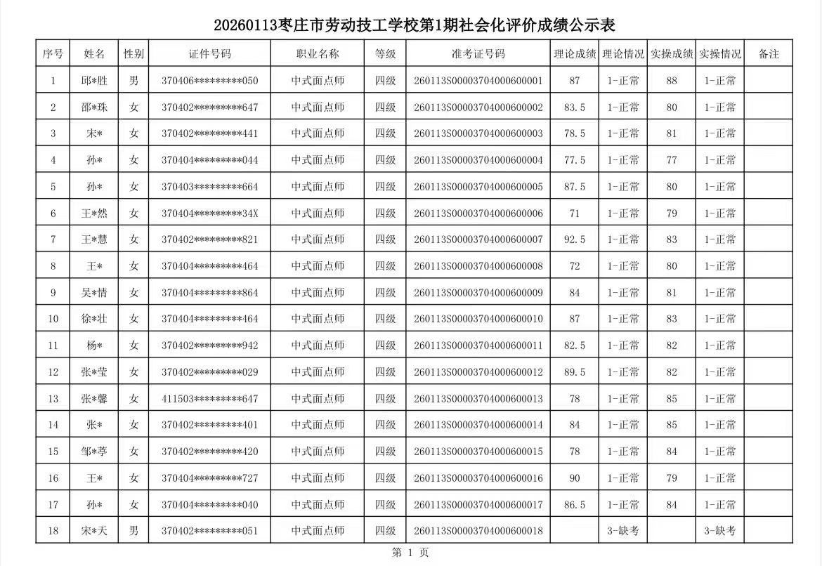 枣庄市劳动技工学校于2026年1月13日组织“20260113枣庄市劳动技工学校第1期社会化评价”,现将考试成绩予以公示。考生对公示情况有异议的,请向枣庄市劳动技工学校培训处反映。